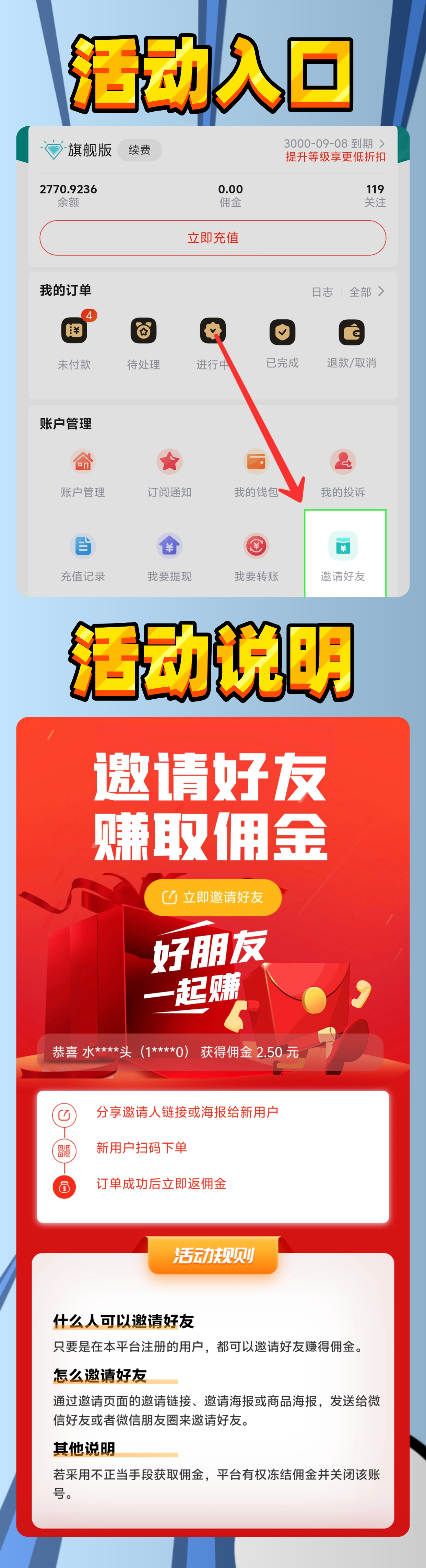 邀请奖励:普通会员拥有邀请权益,成功邀请好友完成下单后,可获得相应比例的佣金奖励。